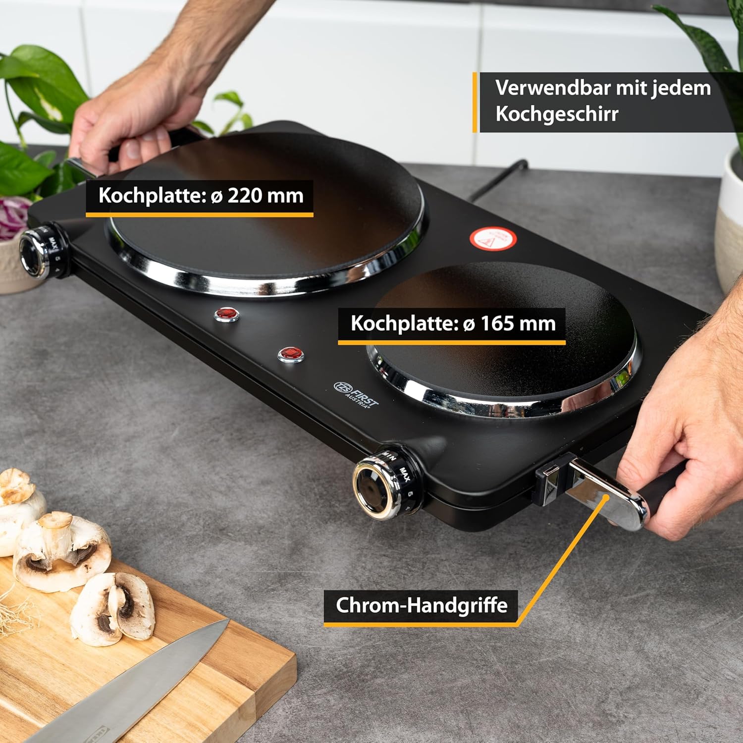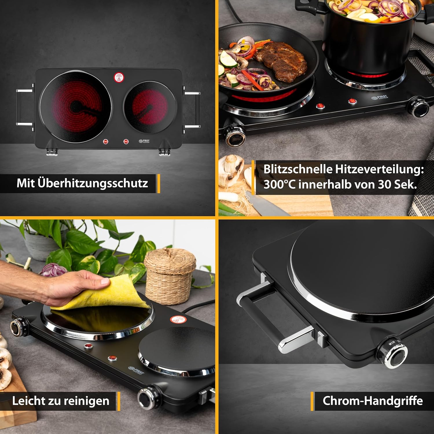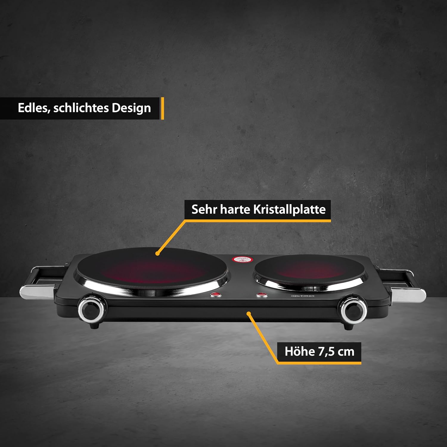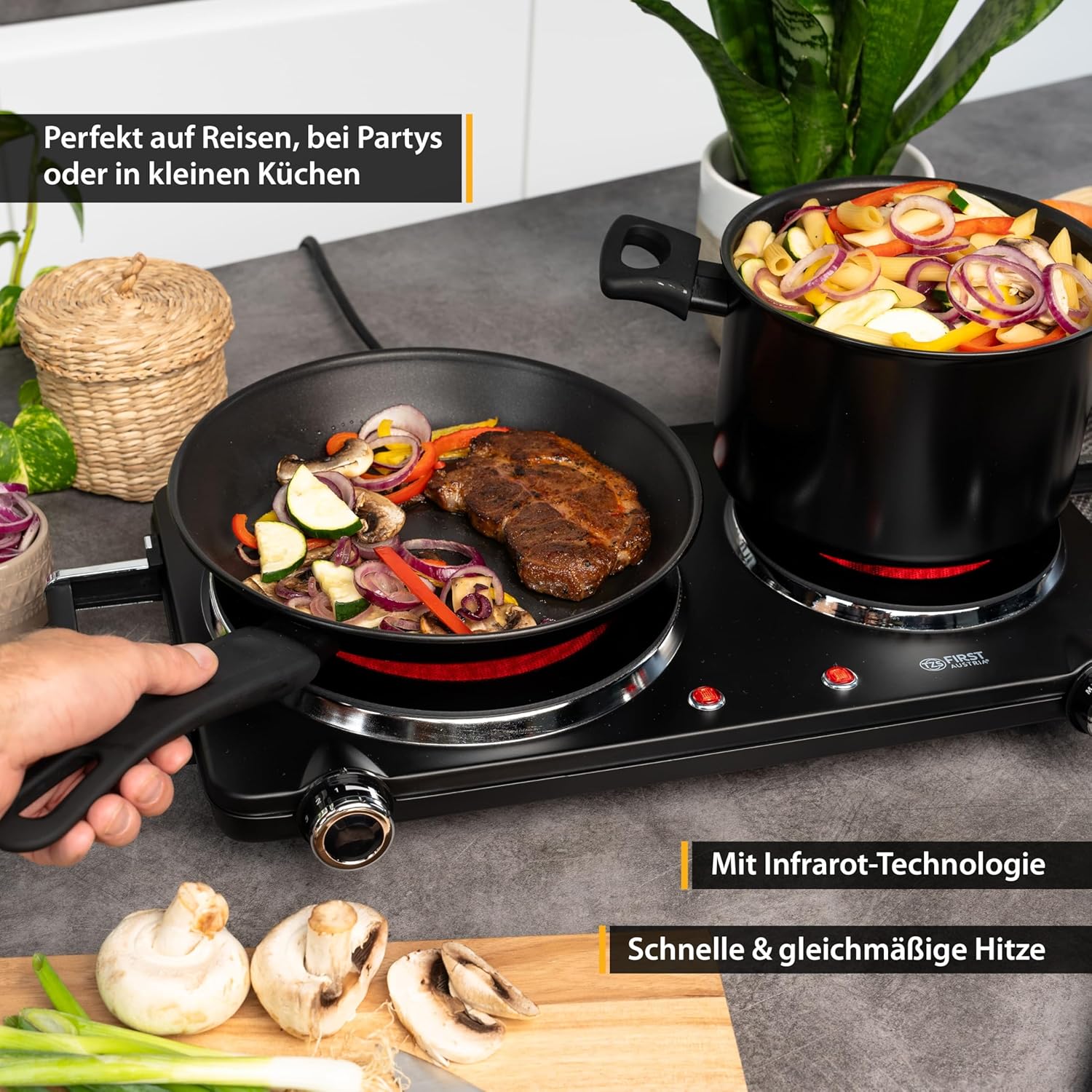 Falë teknologjisë infra të kuqe, pllaka ngroh shumë shpejt dhe arrin temperatura të larta në kohë të shkurtër, duke kursyer kohë dhe energji. Dy zonat e gatimit me madhësi të ndryshme ju japin fleksibilitet maksimal, ndërsa kontrolli manual i temperaturës ju lejon të përshtatni nxehtësinë sipas nevojës. Dizajni i qëndrueshëm dhe sipërfaqja e sheshtë e bëjnë pastrimin shumë të lehtë pas përdorimit.