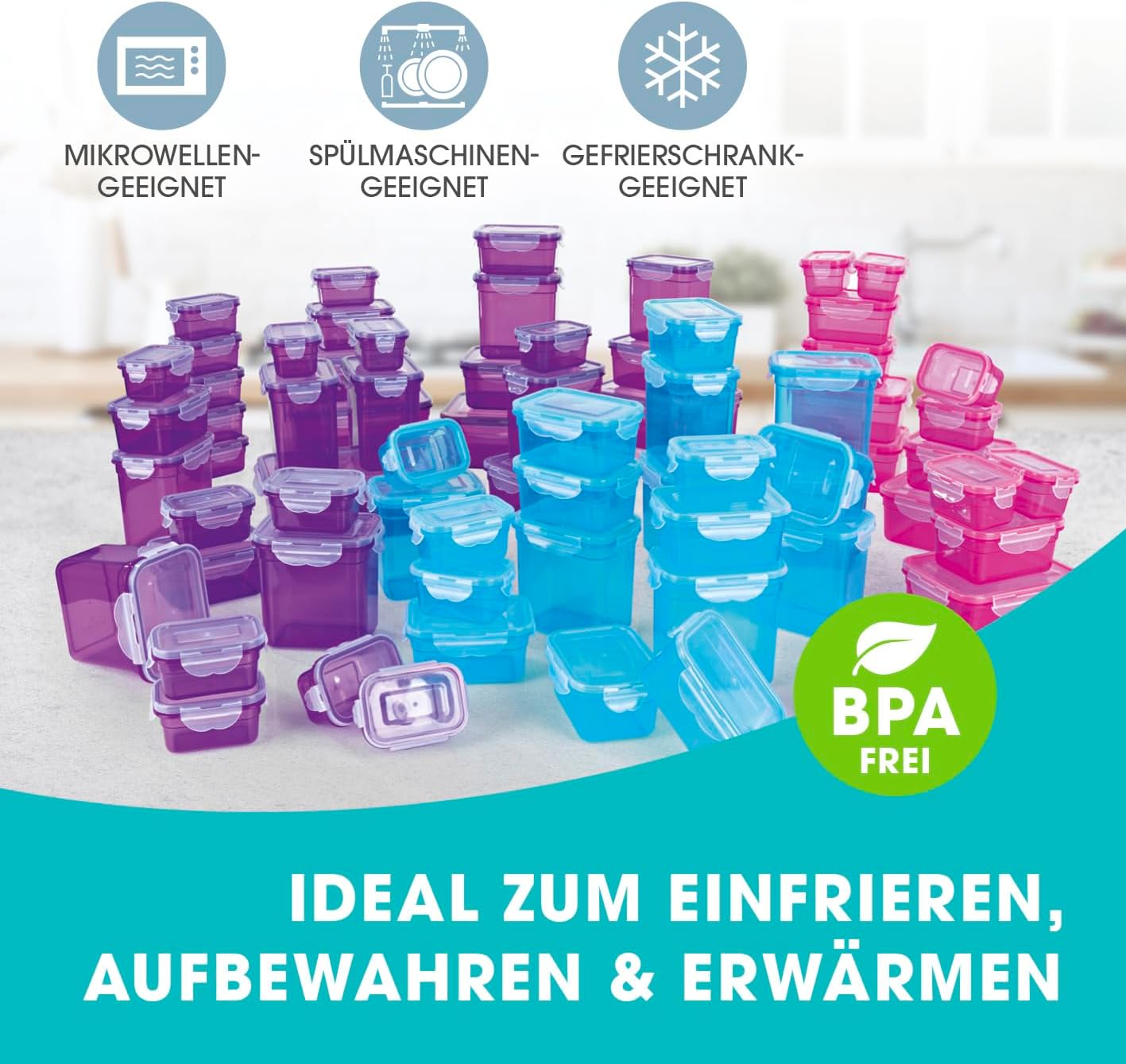Ky set shumëfunksional përfshin kuti në madhësi të ndryshme, të pajisura me sistem mbylljeje hermetike me 4 kapëse (4-fach Klick-Verschluss), që garanton mbrojtje maksimale nga rrjedhjet dhe ajri.